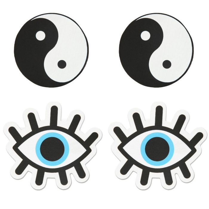 2 Pairs of premium self-adhesive pasties. One pair of Yin and Yang and one pair of Evil eyes.