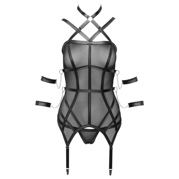 Basque and string from Cottelli BONDAGE made out of stretchy powernet with strap details in a bondage look. The details are made out of beautiful matte look material and there are also silver-coloured metal elements on the basque. The 4 elaborate hand/arm restraints with adjustable hook and loop fasteners make hot bondage sessions possible and they can be attached to the rings at the sides thanks to the 4 snap hook chains. The straps in the cleavage area, the straps of the basque and the suspender straps can be adjusted for a perfect fit. There are also hook fasteners at the back of the basque and press studs on the halterneck.