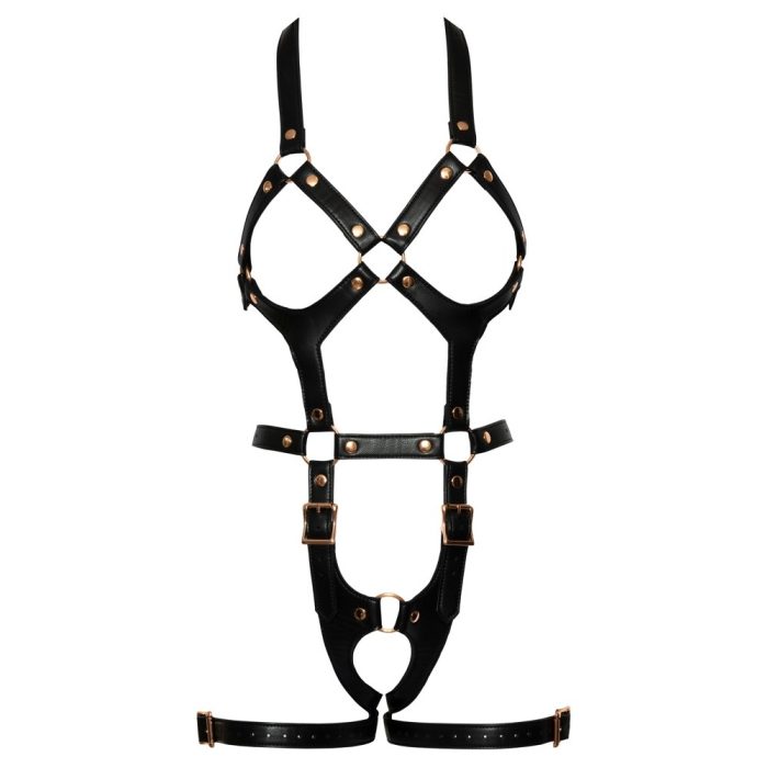 The harness from Bad Kitty is in a stylish leather look with rose-gold coloured metal details. The crotchless harness with open cups has a halterneck and straps that go around the thighs. The straps are made out of soft, vegan imitation leather and can be adjusted with buckle fasteners for a perfect fit.