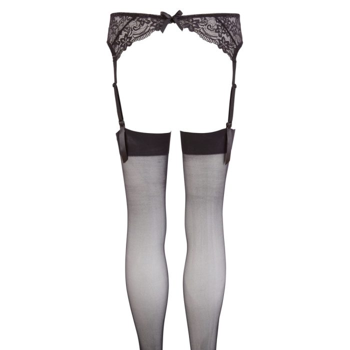 The perfect seducing set! Black lace suspender belt with adjustable suspenders. Simple black stockings included. 100% polyamide.